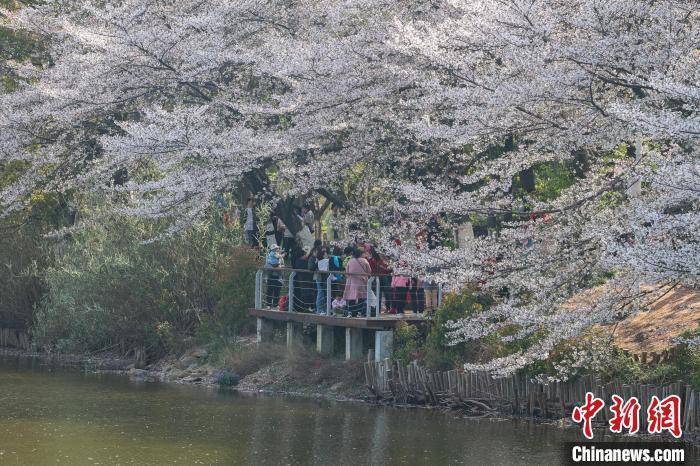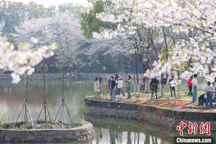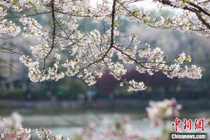 图为粉白的樱花在湖边绚丽绽放,不少游客漫步于樱花树下踏春赏花。 刘力鑫 摄
