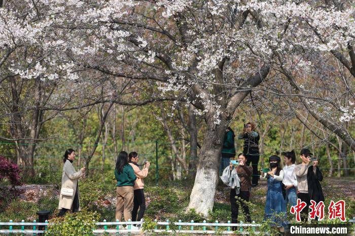 图为粉白的樱花绚丽绽放,不少游客在樱花树下拍照“打卡”。 刘力鑫 摄