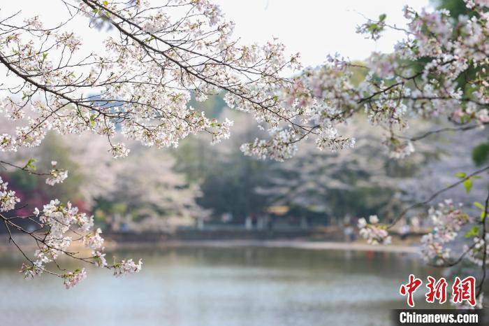 图为粉白的樱花在湖边绚丽绽放。 刘力鑫 摄