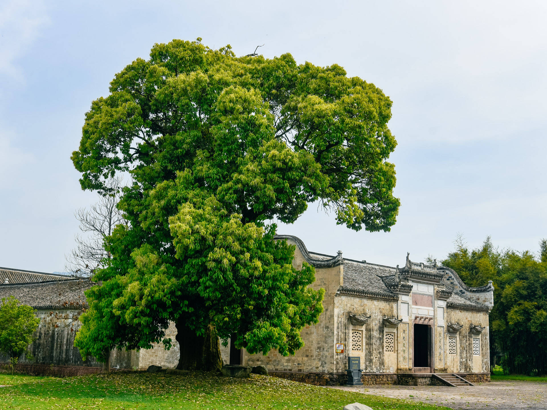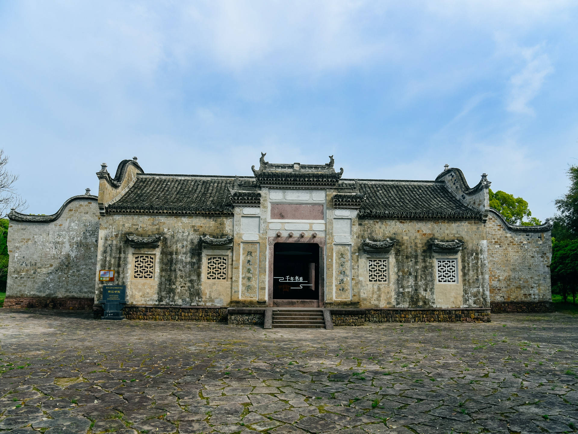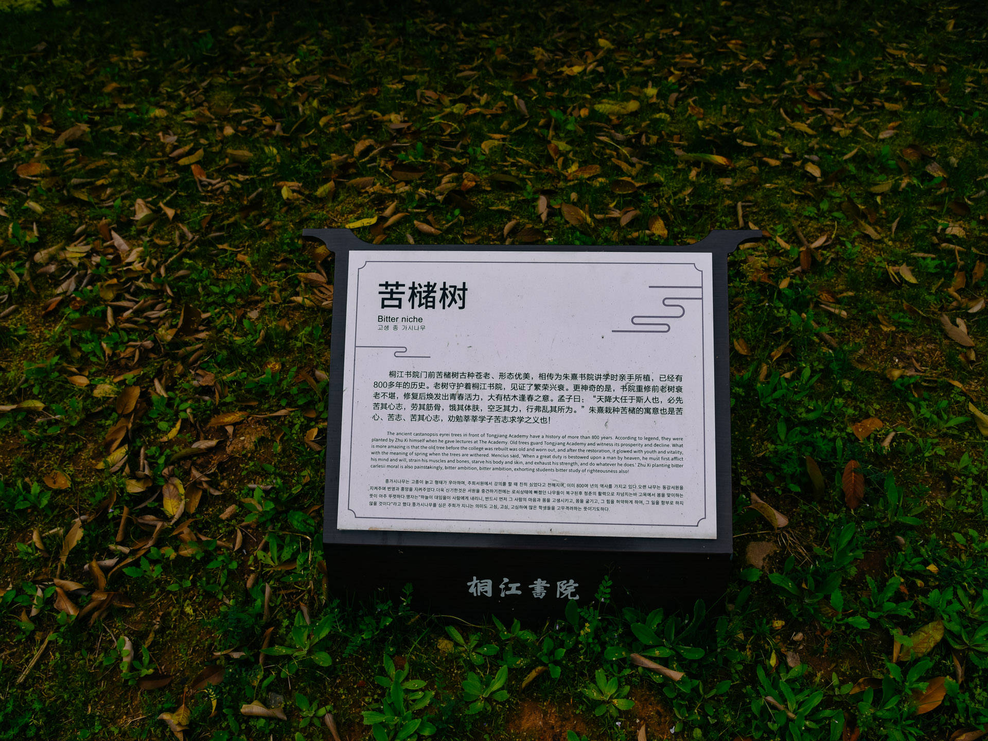 步入书院之内,顿觉清爽,这个地方啊,自带一丝仙风道骨的风韵在里面。走过石牌楼,跨过状元桥,便来到书院的主体部分。而在书院边上两棵高大的苦槠树首先引起我们的注意,边上有小木牌介绍。原来这两棵苦槠树乃是朱熹800年前亲手种植,有“苦其心志”的含义,意在勉励学子们要吃苦耐劳,志存高远,发奋读书。而这两棵古树也是无声见证了800多年来书院兴衰沉浮,如今它们仍郁郁葱葱,给人生机勃发之感。