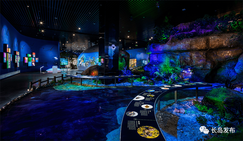 长岛海洋生态文明展览馆主要以讲好长岛践行习近平生态文明理念、建设海上绿水青山的动人故事为主,集中展示长岛海洋生态文明建设目标、规划、内容以及成果,主要以“绿水青山 生态兴岛”为主题,重点布局了“生态文明 美丽中国”、“绿水青山 向海而生”、“生态保护 第一要务”、“生态产业 基础支撑”、“生态制度 重要保障”、“共建共享 基本原则”和“美丽长岛 伟大使命”等七个主题叙事单元,通过声光电等多媒体手段,全方位、立体化的介绍了长岛人文历史、生态资源,展示了长岛在推进海洋生态文明综合试验区建设,打造蓝色生态之岛、休闲宜居之岛中的经验做法,为海岛型地区生态建设提供了生动的“长岛样板”。