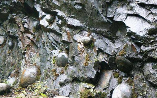 如果你来到这里,你就能看到在崖壁上确确实实有许多奇怪的卵形石头,它们有的是墨绿色,有的是棕色。其实这个"蛋崖"比起其它的悬崖来说不算高,其高度也就6米左右,长约20多米。虽然所占的区域不大,但是我们却找到了近100个这样的"石蛋"。