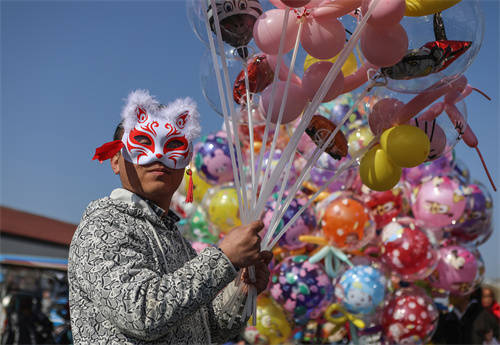 面罩营销,延庆区康庄镇刁营村大集,一位摊主为吸引游客戴上面罩推销气球玩具 赵粤来摄
