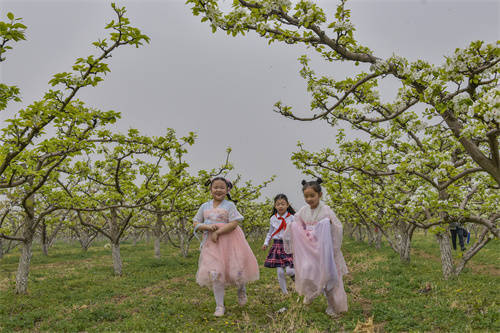 昌乐庄园梨花节现场,少女身着传统服装,奔跑在花海中,享受踏青的愉悦之情 宋建国摄