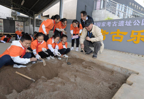 图为2019年,在位于桂林的甑皮岩国家考古遗址公园,考古专家(右一)指导孩子们模拟发掘。新华社记者李贺 摄