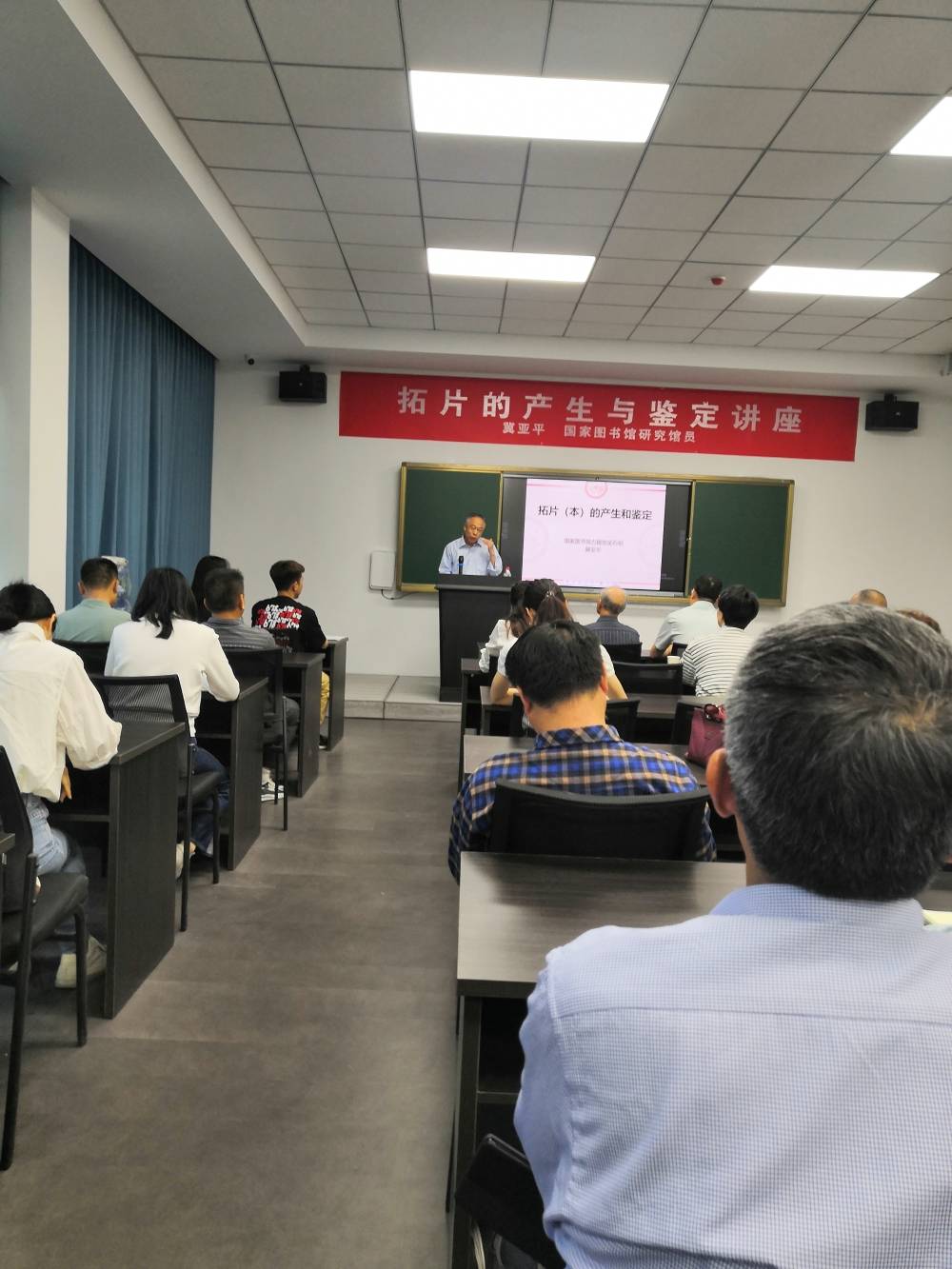图片①国家图书馆研究馆员冀亚平在商城红色小镇1号馆举办“拓片的产生与鉴定”专题讲座。