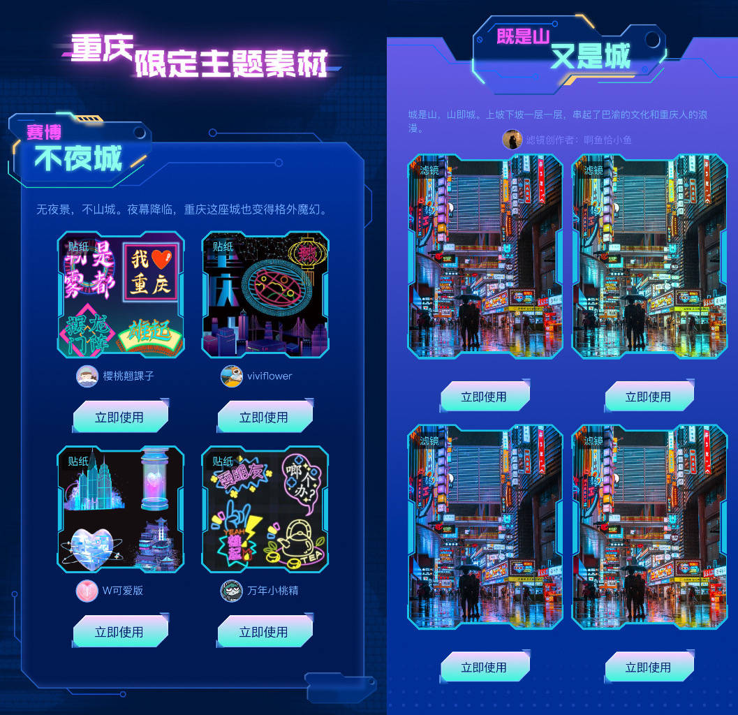 如何为一座城市保留一份独特的记忆?美图秀秀用影像、互动和体验给到了用户认同感。在人文与科技的交叉路口交出了一份优秀的答卷。在“城市环游记”的企划中,美图秀秀不仅精准抓住用户对于热点的追求,还看到了具有历史底蕴的城市文化遗产。在此基础上,运用科技将其巧妙地融合在视觉素材的设计里。例如这次的重庆环游记,美图秀秀将山城的风貌、魔幻都市的现代化生活以及巴渝的人文特色嵌入到了“赛博朋克下的文化回响”这一概念中,让用户既倍感新奇又充满共鸣地领略到了一个更加立体丰满的重庆城。