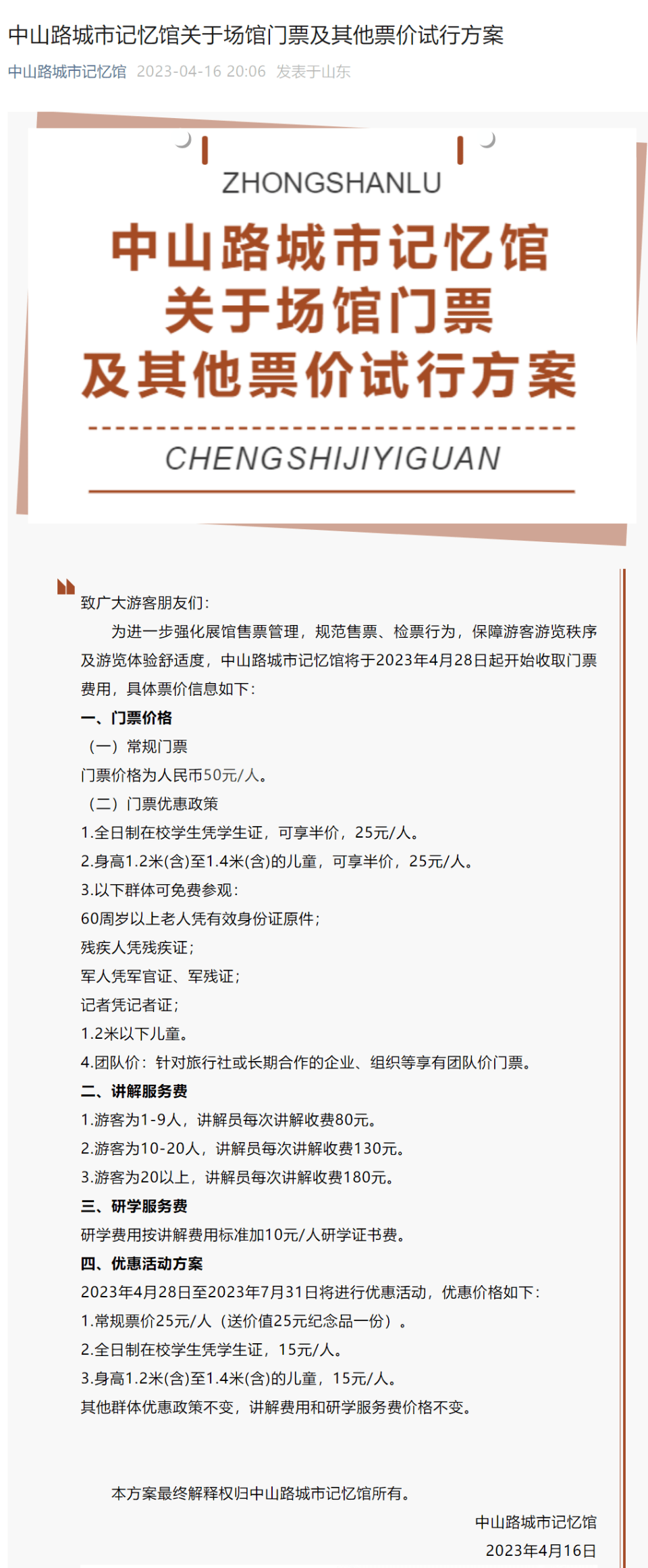 4月16日晚,中山路城市记忆馆官方微信发布了“中山路城市记忆馆关于场馆门票及其他票价试行方案”的公告。