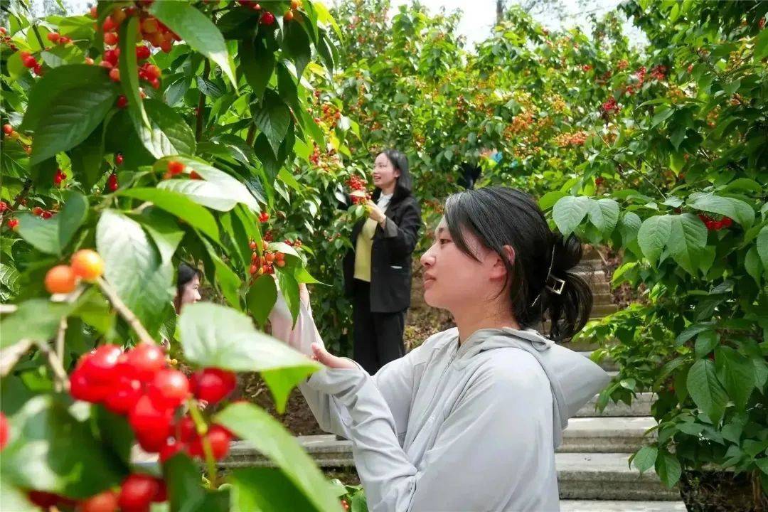 本届樱桃采摘节还在樱花广场设置了樱桃集市,油纸伞“长廊”,现场设有专门的拍照打卡区,人偶互动,趣味十足。 鲜红欲滴,玲珑剔透。在樱桃林里,来自各地的姐妹们尽享樱桃带来的甜和采摘带来的乐!