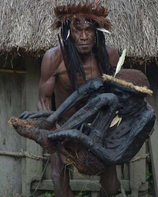 部落首领伊莱·梅布尔拿着他祖先阿加特·马米特·梅布尔的尸体。大约250年前,阿加特·马米特·梅布尔是印度尼西亚巴布亚省一个偏远村庄的部落首领