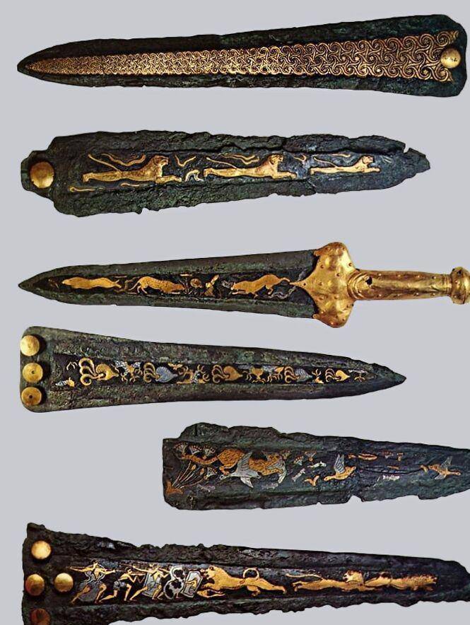 迈锡尼青铜匕首,镶嵌金银。公元前16世纪
