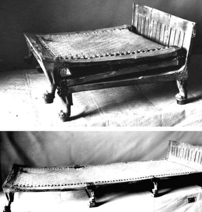 在埃及卢克索帝王谷的图坦卡蒙墓中发现的一张三折床。它被认为是同类中的第一个,在当时是非常复杂的。这张床折叠成Z字形,使它变得紧凑,便于运输