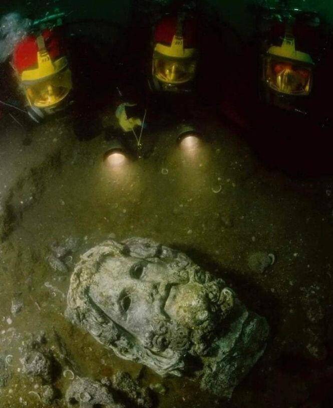 在沉没的埃及沿海城镇老人星发现的,潜水员在塞拉比斯的头上照灯,这座完整的雕像曾经超过4米高,可以追溯到公元前200年左右