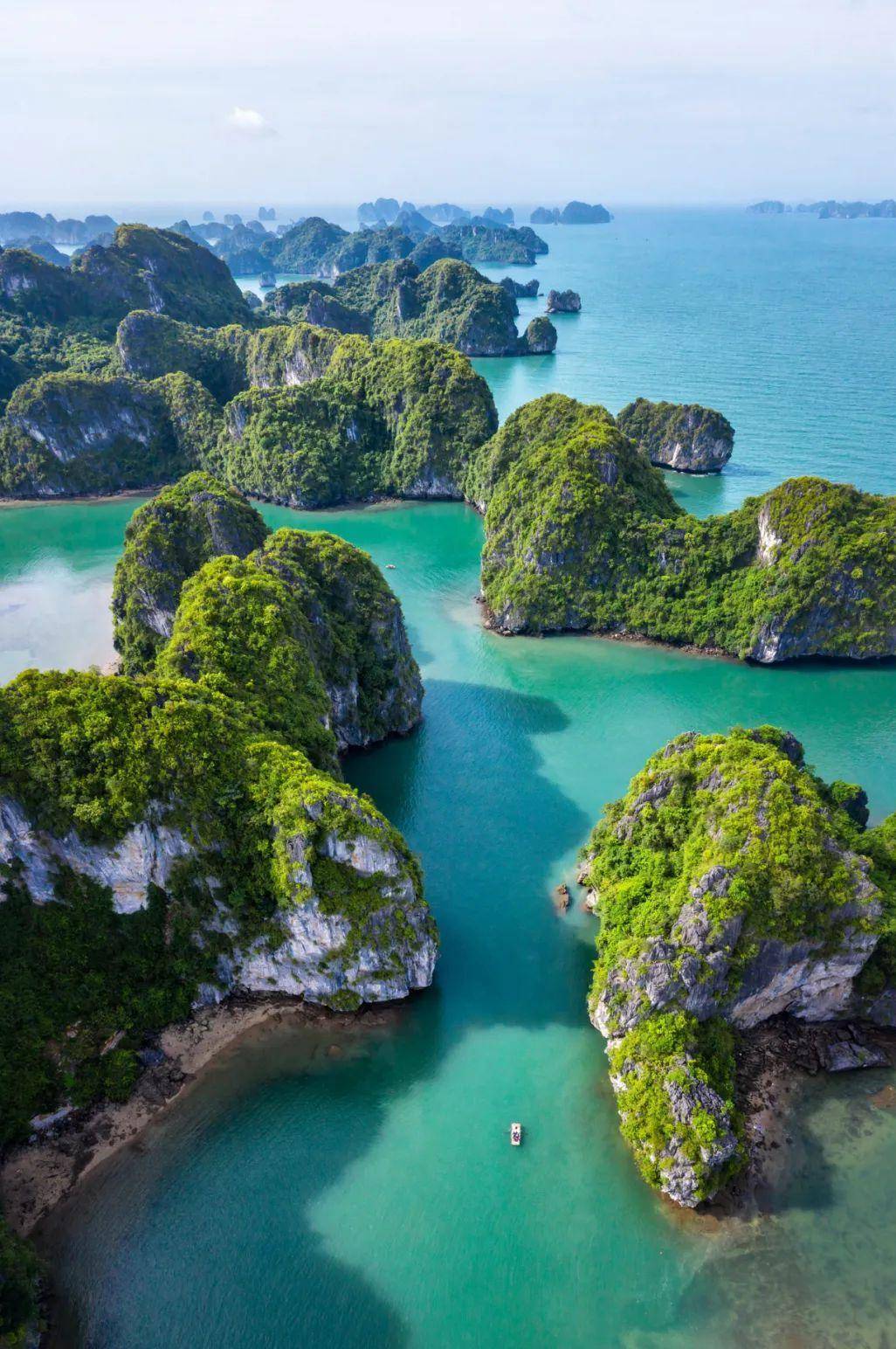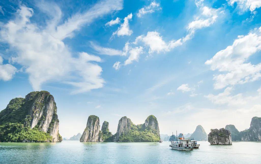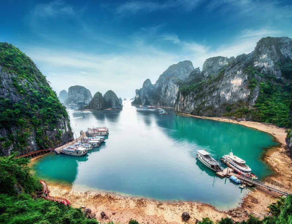 下龙湾位于北部湾之中,一座座石灰岩柱从碧玉般的海水里破水而出,其间还点缀着一个个头顶森林的小岛。“下龙”意为“蛟龙下海之地”。