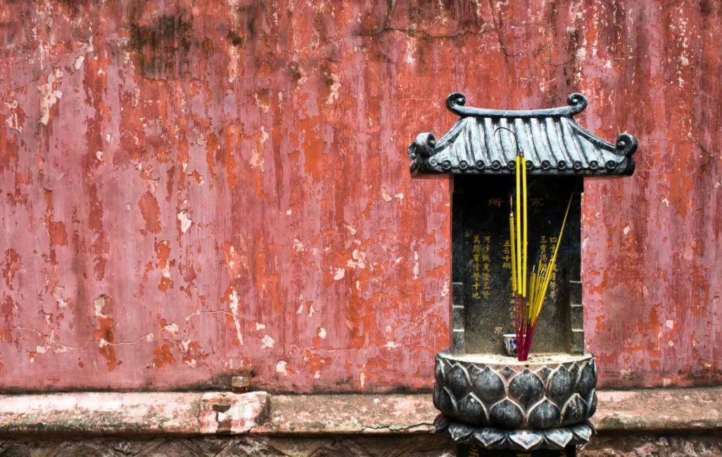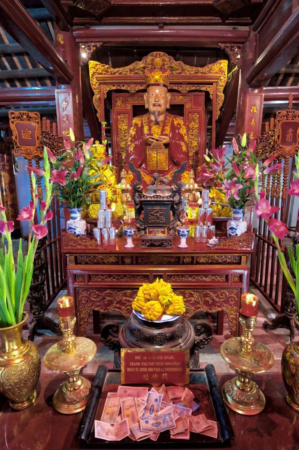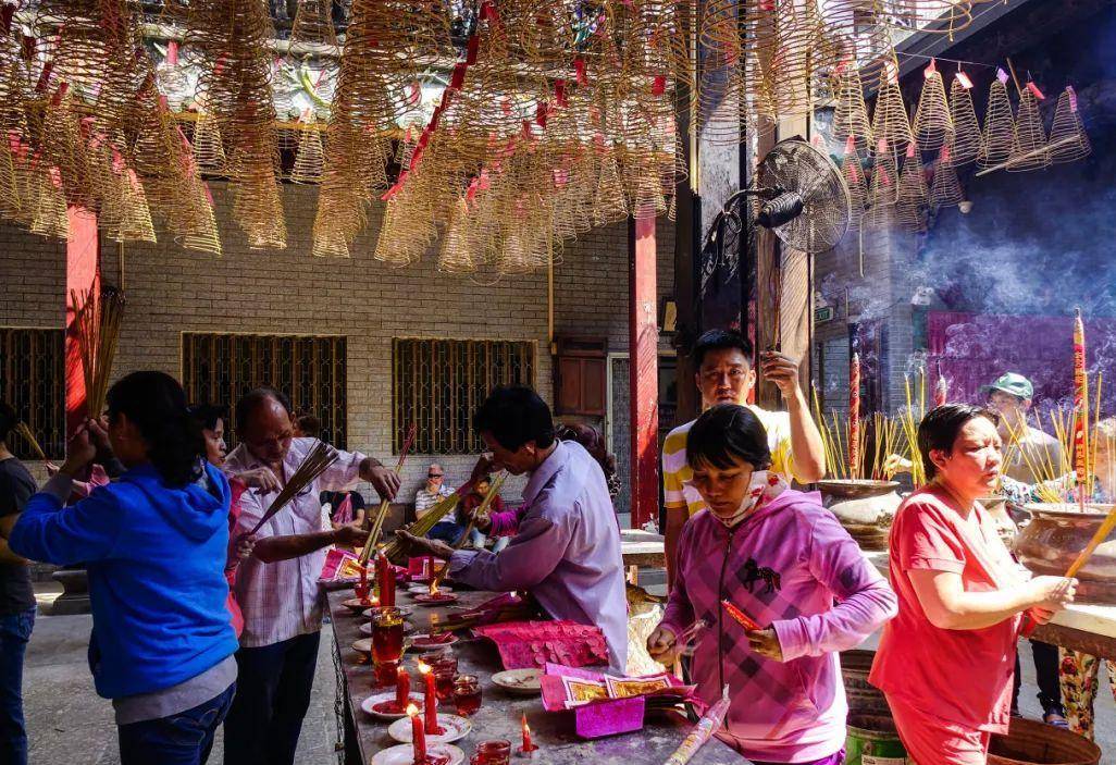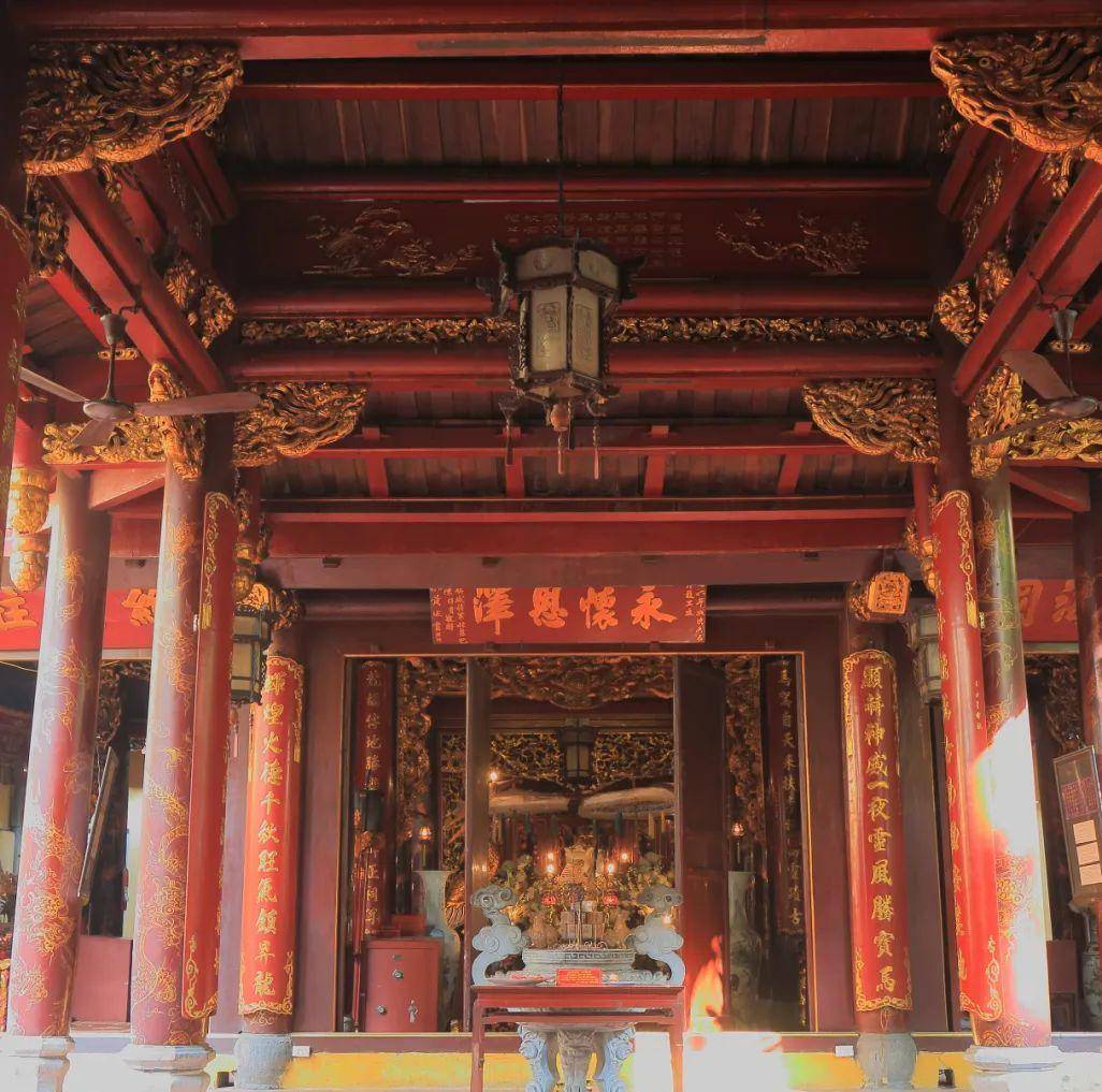 前面绿树成荫,里面的寺庙有红、金、绿、黄等装饰颜色,相映成趣。这座可以追溯到1902年的寺庙是装饰得最漂亮的寺庙之一。这里的特色是精细的黄铜祭典装饰和武器,还有祭坛、墙壁、柱子、悬灯和盘香上的木雕。再往里,仔细观察屋顶的装饰瓷画,每幅上都绘制了无数小小的人物。