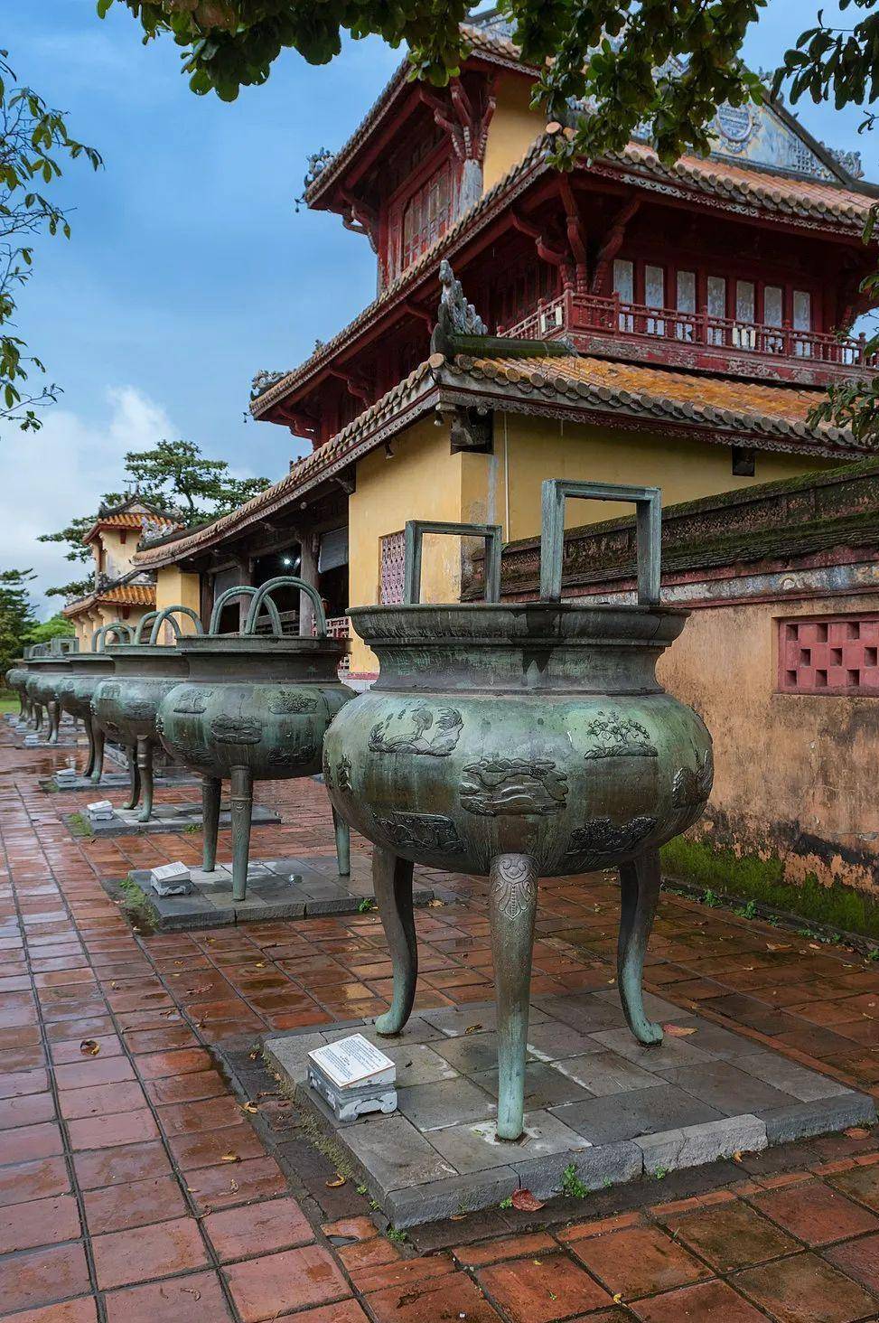 守护着该建筑群最北端的是四方无事楼(Tu Vo Phuong Pavilion)。从那里可以顺着护城河来到长生宫(Truong San residence),然后转而向南便到了4延寿宫Dien Tho Residence)。最后再欣赏一番精心修复的太祖庙(To Mieu)建筑群。这里堪称是整个游览过程中最有收获的部分,其中包括精美绝伦的5九鼎(Nine Dynastic Urns)。