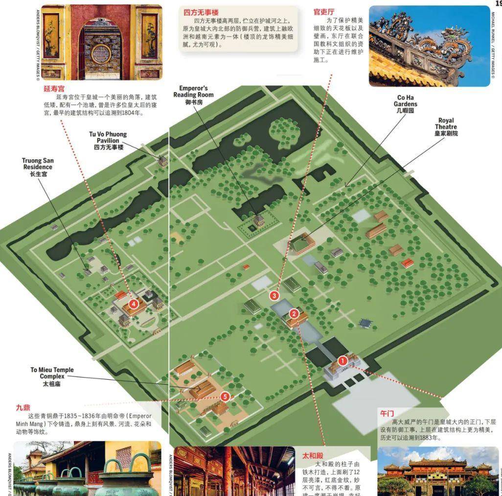 直接穿过庄严的1午门(Ngo Mon Gate)会看到售票处。当你走进这座城中城时,迎面而来的恢宏场面会让你心跳加快,肃穆感油然而生。正前方是2太和殿(Thai Hoa Palace),国王曾高踞在自己的王座上接见来访的使客。继续向北你会经过一个小庭院,通往3官吏厅(Halls of the Mandarins),官员们曾在这两个大厅办公及准备各种仪式。