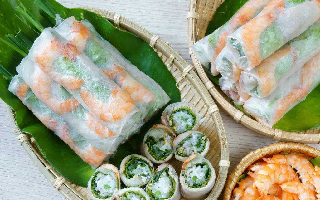 几乎所有东西都被越南人用轻薄易碎的米纸包起来了。在餐桌上,蒸鱼和烤肉通常和香草、生菜、切片的酸杨桃以及青香蕉包在一起,然后蘸上鱼露一起吃。胖嘟嘟的goi cuon,是一种南部的特色食物,通常被视作是沙拉或“夏”卷,包含有鲜虾、猪肉、米粉和香草,需要蘸着豆酱或海鲜沙司一起吃。