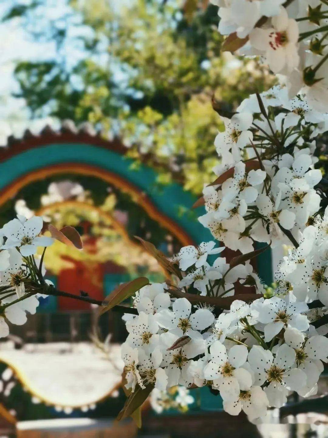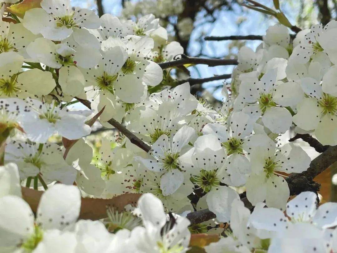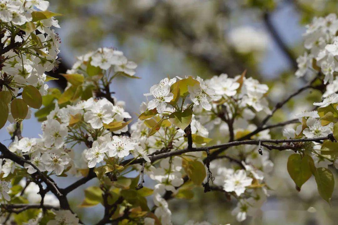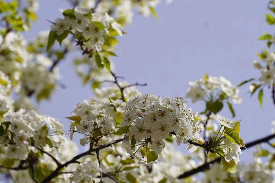 四月的一阵春风吹开了枹罕山庄满园的梨花,微风和煦,花香埋满小径;漫步梨园,看柔美洁白的花瓣摇曳生姿。枝头之上,晴空如明镜,一个不经意的抬头,才知道是那一簇簇梨花的倒影。
