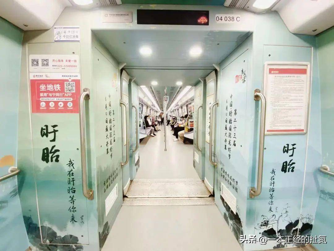 当日,主题专列车厢内壁一抹抹绿色水墨中点缀着盱眙文化旅游景点和盱眙龙虾的“美照”:铁山寺、天泉湖、第一山、明祖陵,山水文化沁润了盱眙风华;十三香龙虾、蒜泥龙虾、都梁香龙虾,美食节庆带动了乡村振兴。除了“美景”、“美食”,这趟主题地铁专列还为第一波乘客准备了一场“邂逅”,乘客们一进站,就看到一群身着汉服的姑娘飘轻裾、翳长袖、翩翩起舞。舞罢,姑娘们跟乘客一起进入车厢,向乘客推介盱眙的各个景点。