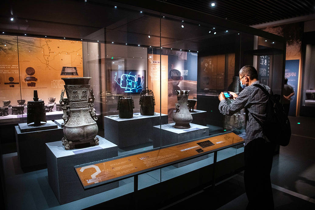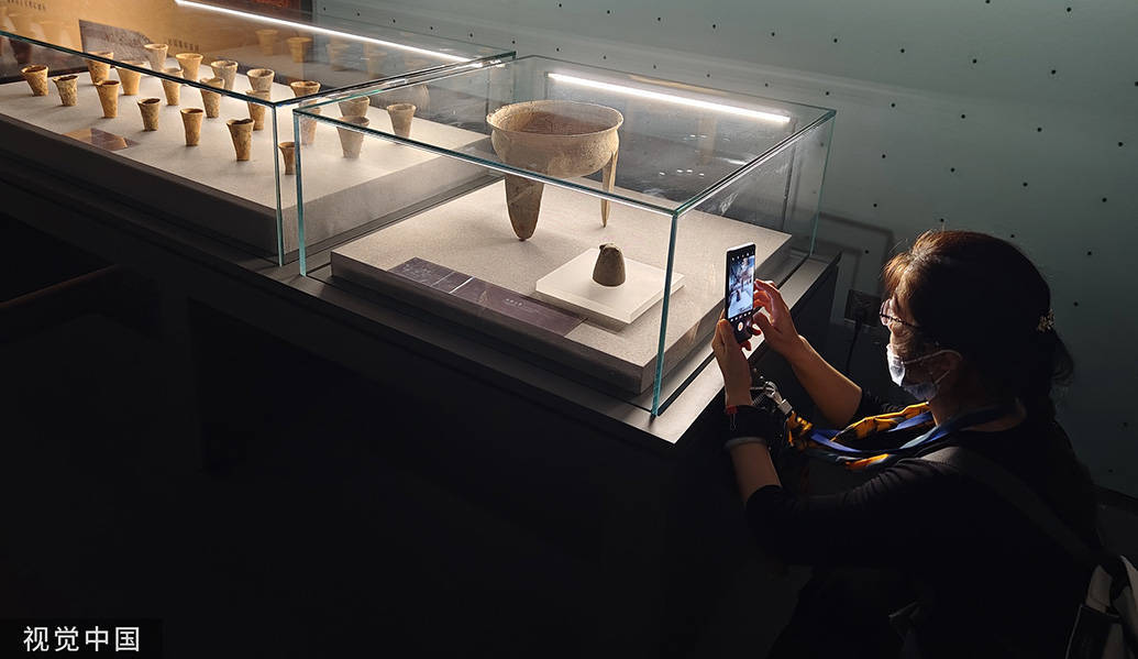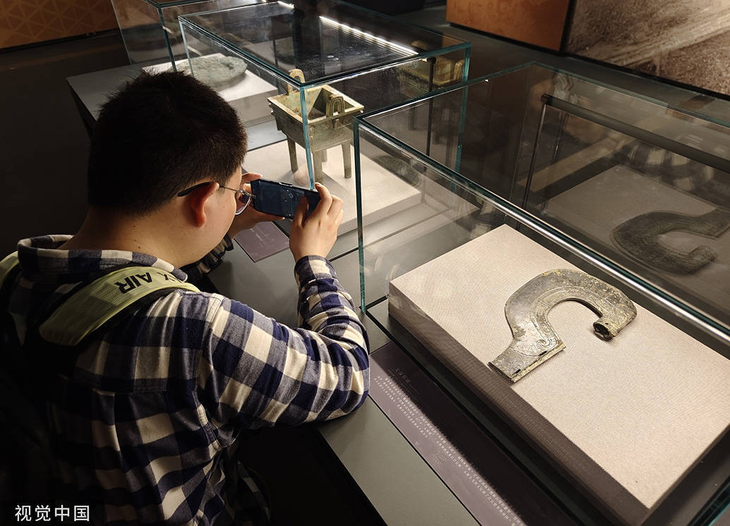2023年4月18日,武汉,湖北省博物馆,惟见长江天际流——考古中国·长江中游文明进程研究成果展,观众为展品拍照留念。
