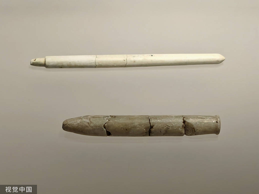 2023年4月18日,武汉,湖北省博物馆,惟见长江天际流——考古中国·长江中游文明进程研究成果展。玉笄,肖家屋脊文化时期,天门邓家湾遗址出土,湖北省博物馆藏。