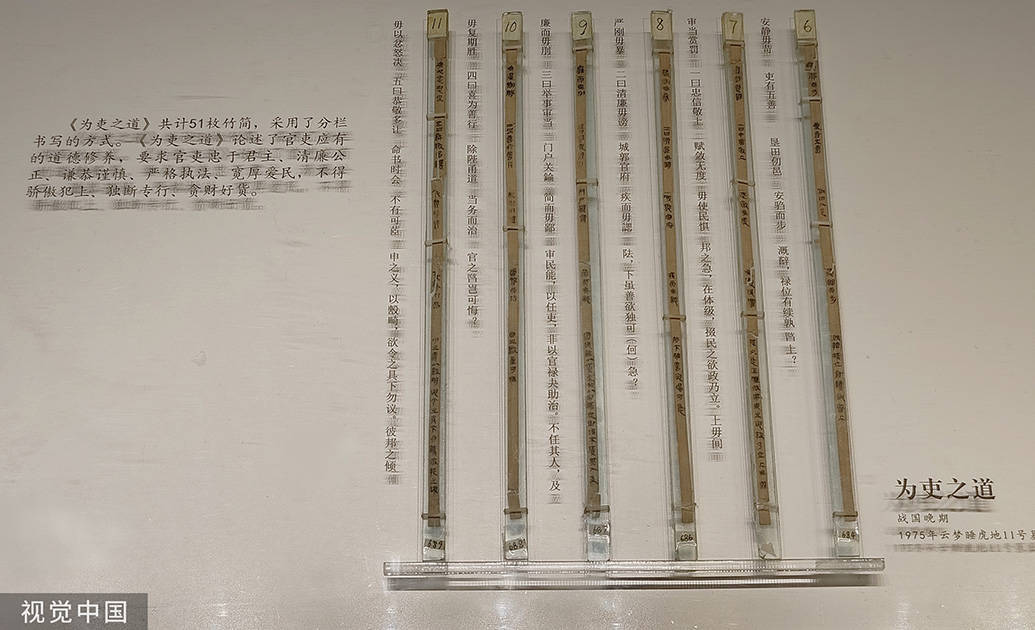 2023年4月18日,武汉,湖北省博物馆,惟见长江天际流——考古中国·长江中游文明进程研究成果展。《为吏之道》竹简,战国晚期,1975年湖北云梦睡虎地11号墓出土。
