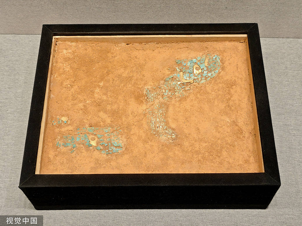 2023年4月18日,武汉,湖北省博物馆,惟见长江天际流——考古中国·长江中游文明进程研究成果展。绿松石镶金饰件,商代早期,黄陂盘龙城王家嘴17号墓出土,盘龙城遗址博物院藏。