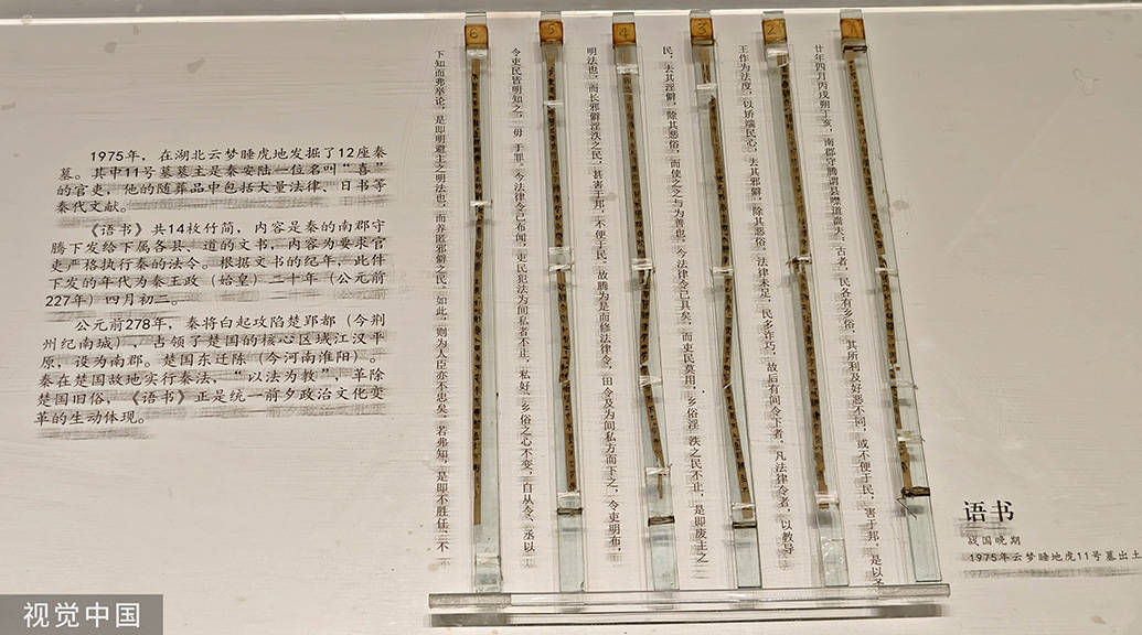 2023年4月18日,武汉,湖北省博物馆,惟见长江天际流——考古中国·长江中游文明进程研究成果展。《语书》竹简,战国晚期,1975年湖北云梦睡虎地11号墓出土。