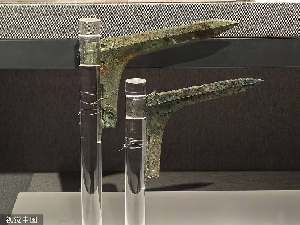 2023年4月18日,武汉,湖北省博物馆,惟见长江天际流——考古中国·长江中游文明进程研究成果展。越王勾践玄孙铜翳戈,战国中期,樟树国字山1号墓出土,江西省文物考古研究院藏。