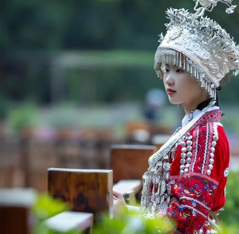 那么关于苗家人的银帽呢,一定有许多人认为苗族银帽上的是一对牛角,但其实并不是,这实则是一对鸟的羽翼,苗族崇拜自由飞翔的鸟儿,所以便将这些羽翼立于她们的头冠上,寄托向往的光明与自由!