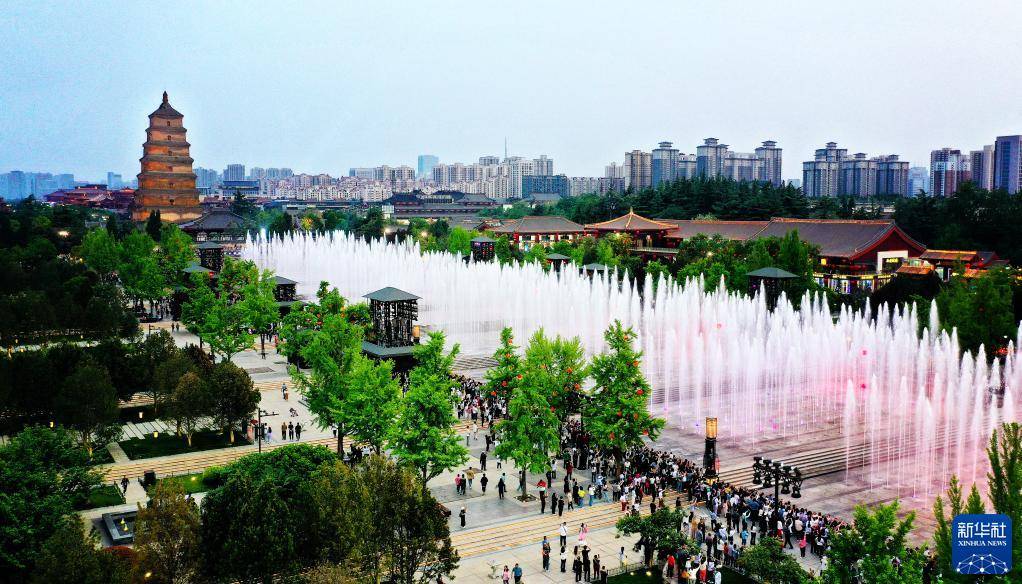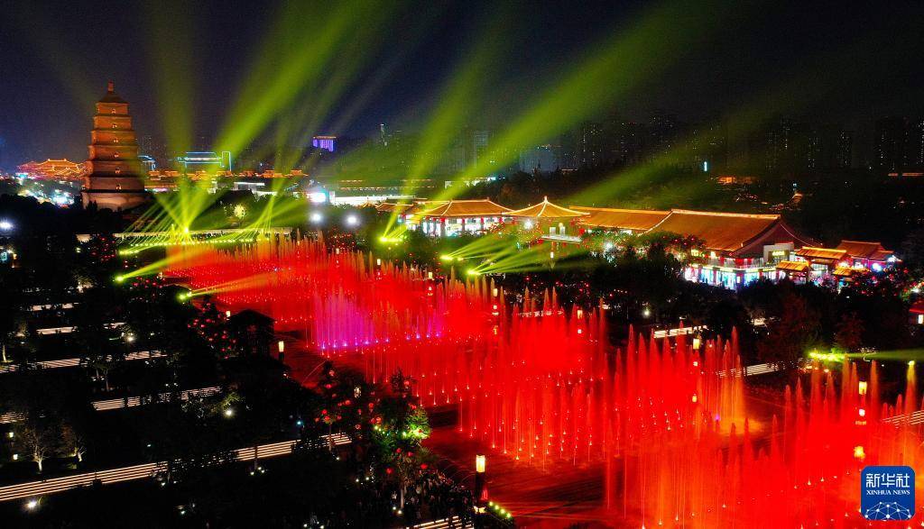 陕西西安大雁塔北广场音乐喷泉是西安旅游打卡地之一,每天会进行四场演出,吸引市民和游客前来观看。