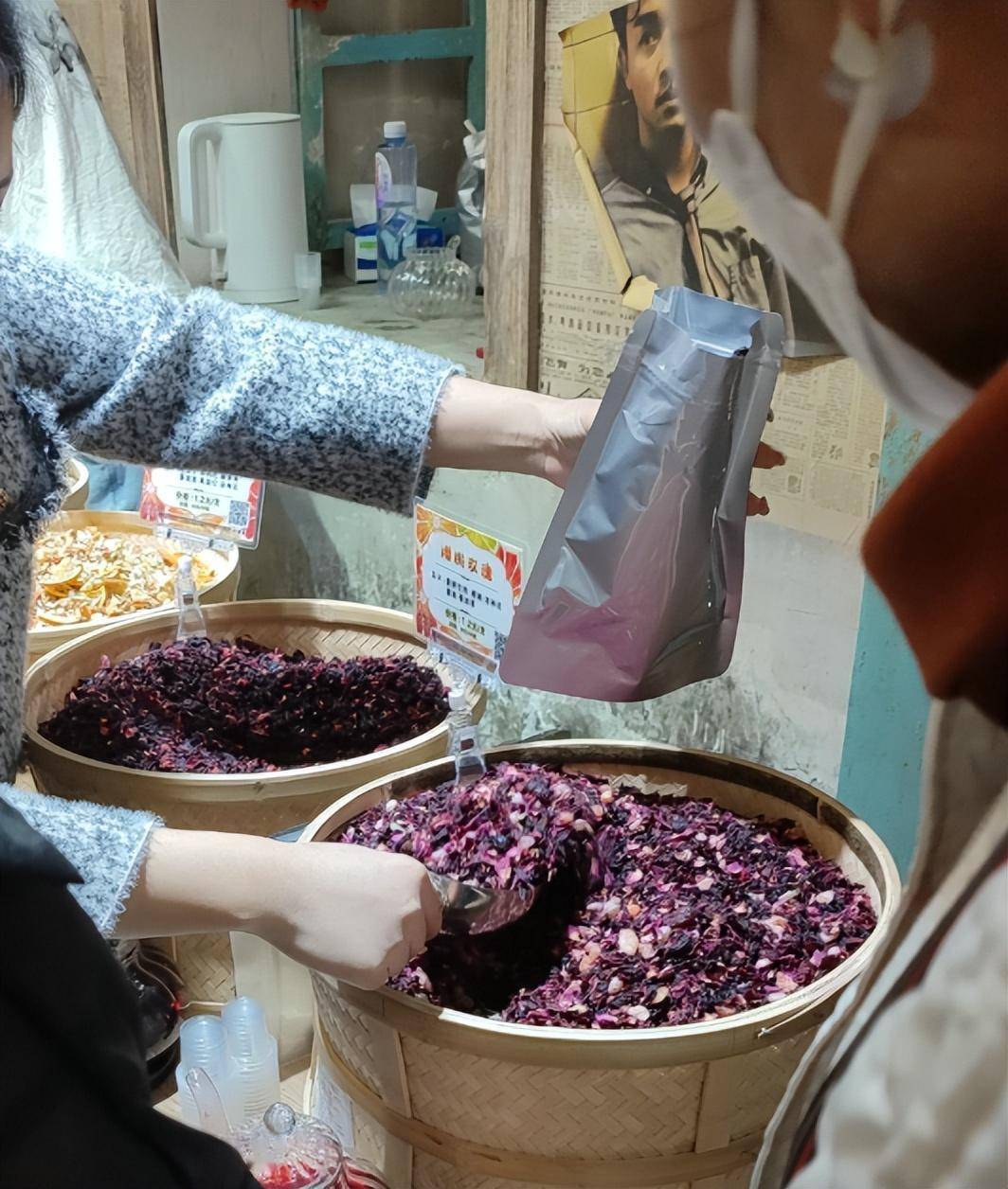 距离南口不远,有一个杂货店,卖的多数是怀旧商品,如“80后”小零食、小玩具等。店面深处,传来一阵花果香味,店员热情地端着一次性小塑料杯,请进店的游客品尝一种紫红色的液体。这是一种冲泡的花果茶。