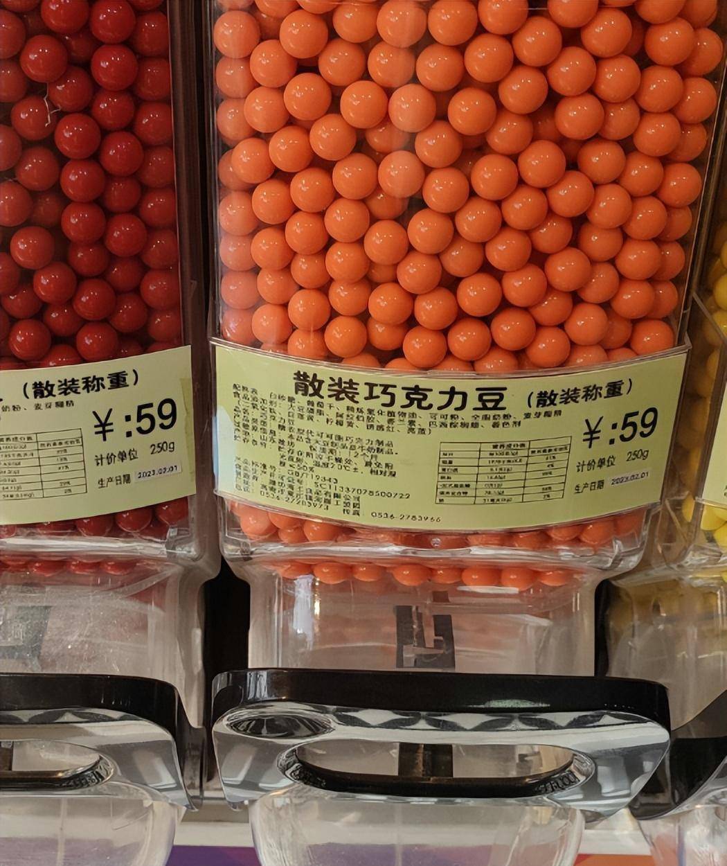 在另一家糖果店,还能看见一种59元/250克的巧克力豆。59元的字体是又大又醒目,250克的字体则是又小又不起眼。记者在收银机上看到,结账的时候,机器屏幕上显示的单价是236元/千克。高价带来的压力,一瞬间扑面而来。
