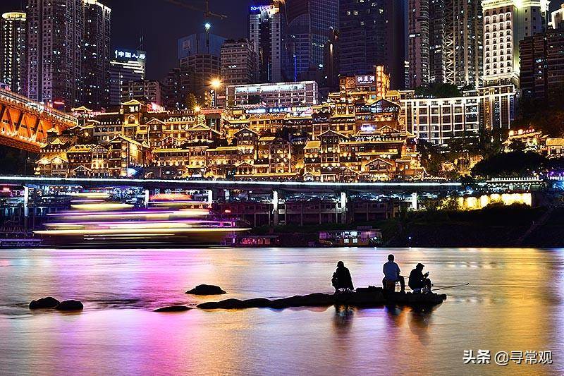某个夏夜,我又一次站在洪崖洞的江对岸拍摄,看着眼前这座流光溢彩的“天空之城”,轮船在江面拖出一条条光带,几个钓鱼人在江中礁石上垂钓……