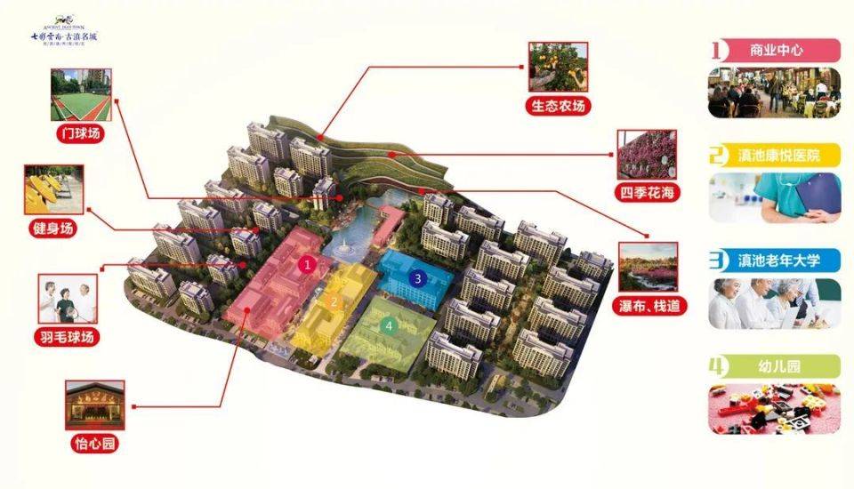 古滇康养园,位于云南省昆明市晋宁区,滇池侧畔的七彩云南古滇名城度假区核心位置,这里是“世界春城”、“中国天然氧吧”、国家生态旅游示范区。康养园2017年正式投入运营,以高端品质、先进理念和优质服务,集合丰富旅游资源、顶级医疗资源以及特色文化资源,为长者们打造一个医康养一体化身心疗愈旅居胜地,与所有长者一起共创美好晚年生活。