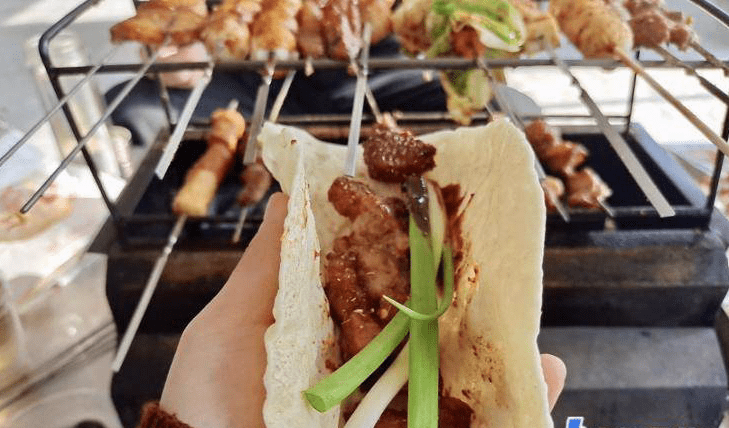 虽然味道没有特别的惊喜之处,但这样的豪爽操作,有没有一种“水浒好汉”的感觉呢?尤其是当你在卷饼上撸一串烤熟,放一根小葱,然后摊一些面酱,最后沾一沾孜然粉,真是大口吃肉,大碗喝酒啊。
