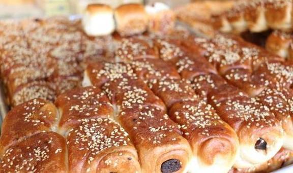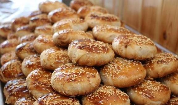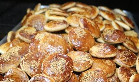 咸烧饼是否好吃,全看做工和内馅。刘军华家的咸烧饼每一枚都是手工制作。透过镂空断隔,4名师傅正有条不紊地制作。只见他们将揉好的面团搓成长条状,切成大小相似的小剂子。再用擀面杖将剂子擀成碗状,用手轻托面团,包上馅料,迅速封口,整个动作一气呵成。最后在烧饼的表皮涂上蛋黄液,撒上芝麻,放进烤箱等待即可。