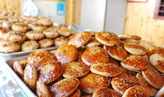 “嘀”的一声,新烤制的咸烧饼出炉了!瞬间,整条老街都飘散着咸烧饼的香气。外面的酥皮被烤制金黄色,是最漂亮的蟹壳黄,还微微泛着些油光,是视觉和味觉的双重吸引。然而,美味需要等待,这时的咸烧饼并不能直接食用,需要在空气中静待几分钟,等到表皮酥脆方可食用。