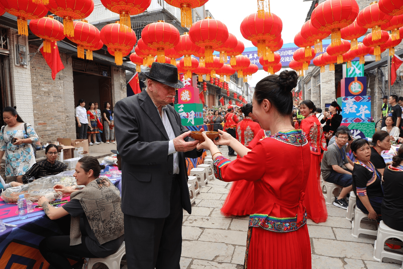 龙州人民向法国游客敬迎客酒(央广网发 蒋子璇 摄)