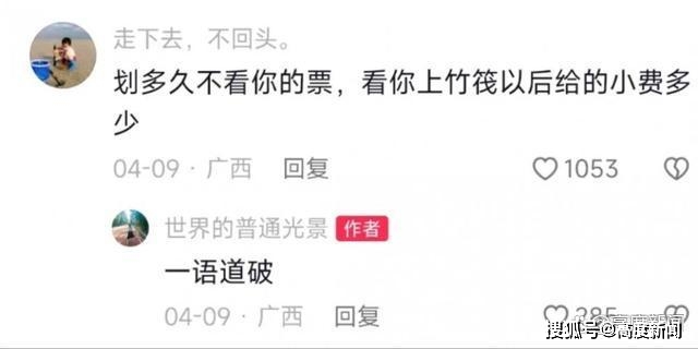 除了小费,还有网友表示,遇到太阳刺眼的时候,要想打开竹筏上的遮阳伞,也会被收取60元的费用,“竹筏上有一把太阳伞,打开需要60元,我认为不合理没有付费,结果腿后来被晒伤了。”上游新闻记者尝试通过私信联系几位当事人,但均未获回应。