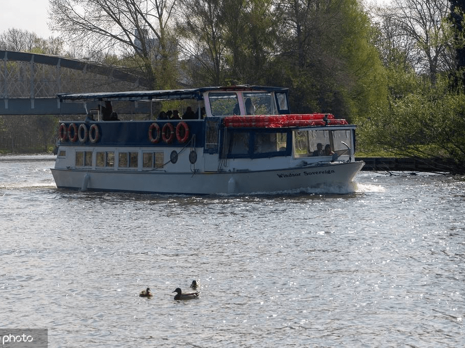 英国伯克郡温莎,阳光明媚,“法国兄弟”船航行在泰晤士河上。