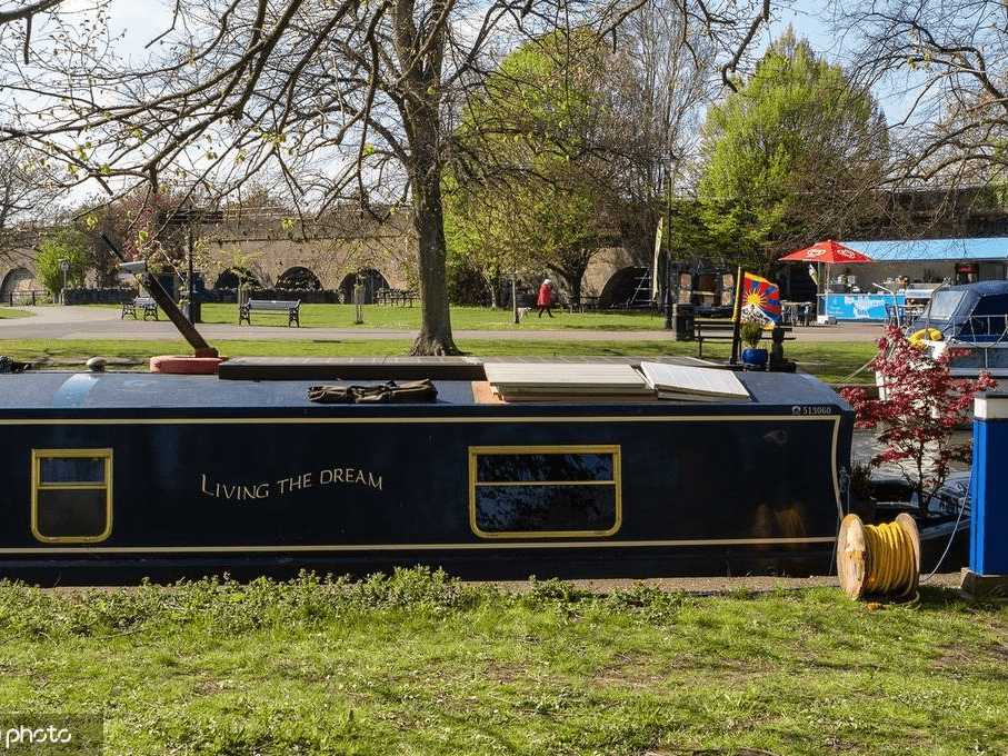 英国伯克郡温莎,阳光明媚,一艘驳船停泊在泰晤士河上。