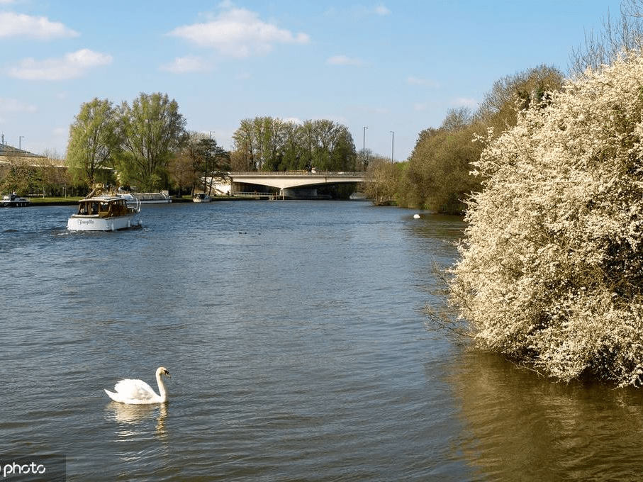 英国伯克郡温莎,阳光明媚,天鹅在春花盛开旁的泰晤士河上游泳。