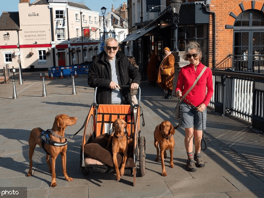 阳光充足,三个匈牙利短毛指示犬在温莎桥上散步和乘车。