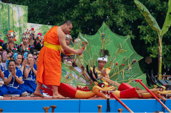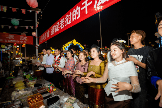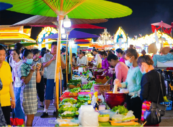 进入4月第三周,超过50%的中国人不是已经身处西双版纳,就是在去版纳的路上,或者通过云端参与泼水狂欢,共同参与傣历1385年新年节。在这个相当于傣族除夕夜的晚上9点左右,南腊河星光夜市上空升起连绵不断绚烂的烟花,像是对16个小时后即将开始的全球独一份彩虹泼水节进行倒计时和预热。视觉盛宴大约持续了30分钟,这个时间段里,整个东经101.56°、北纬21.48°的夜空,都在为下方的勐腊闪耀,彩色焰火不断变化形状,把夜市对面即将交付的南腊新区映照成了令人神往的彩虹国度。