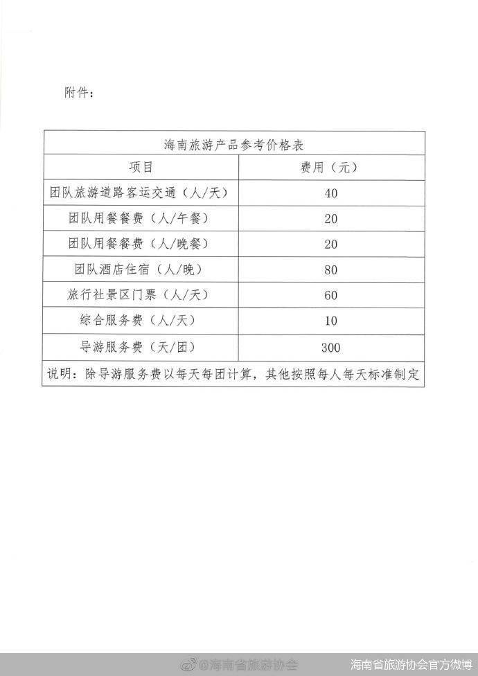 北京商报讯(记者 关子辰 张怡然)4月19日,据海南省旅游协会官方微博,海南省旅游协会联合海南省旅行社协会、海口市旅行社协会,发布了《关于海南旅游产品参考价格》的通知(以下简称“《通知》”)。其中提出,导游服务费每天300元/团,团队酒店住宿每人80元/晚。