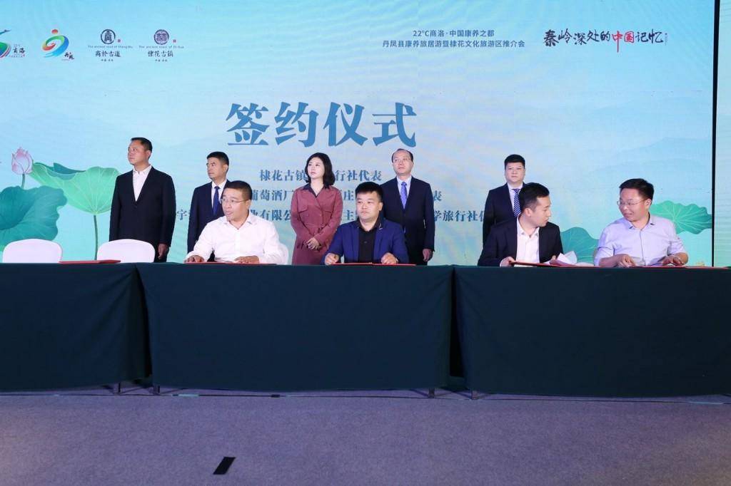 随后,棣花古镇、陕西丹凤葡萄酒厂(丹凤酒庄)、陕西天宇润泽生态农业有限公司(核桃主题公园)分别与旅行社代表签约了景区旅游协议。杨建峰、薛伟、李兴龙分别向陕西汉唐文化创意研究院、陕西省旅游设计院有限责任公司、贾平凹文化艺术研究院颁发聘书,并接受贾平凹文化艺术研究院《棣花印象·宋金往事》贾平凹书法作品捐赠。推介会还举行实景演艺《棣花印象·宋金往事》剧目和丹凤特色民俗节目表演。