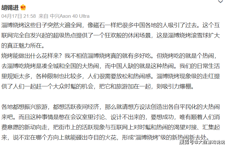 淄博烧烤,在今年的初夏,成功出圈。今天下午,淄博烧烤的相关话题,再次登顶微博热搜第一。著名的媒体人胡锡进先生,在昨日发表了一篇分析淄博烧烤的一篇文章。在这篇文章中,胡锡进先生指出:“烧烤能做出什么花样来?我不相信淄博烧烤真的就有多好吃。但烧烤吃的就是个热闹,去淄博吃烧烤是凑全城和全国的大热闹,而中国人缺的就是这种热闹。”
