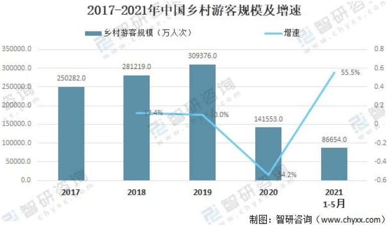 2017—2021年中国乡村游客规模及增速 图源:智研咨询